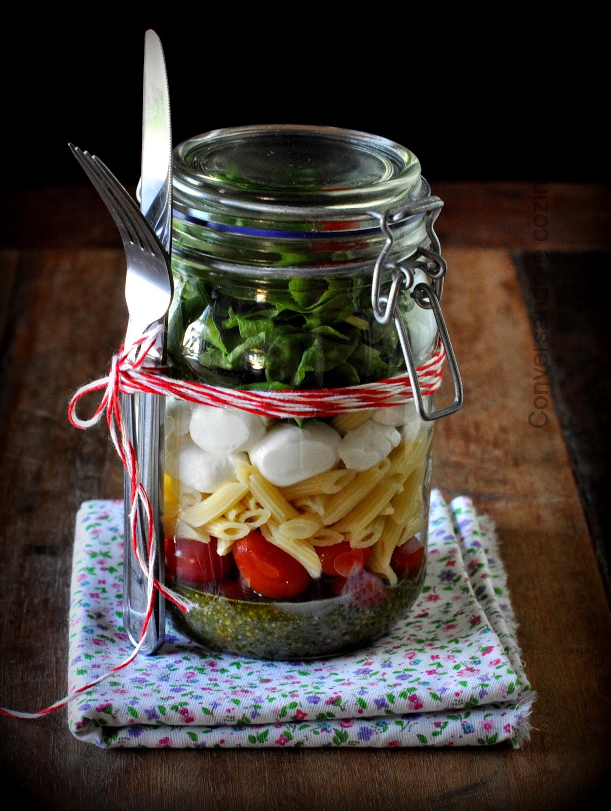 Essa eu preparei assim; Lavei e esterilizei um pote de vidro (é importante que tenha uma vedação boa), coloquei o molho pesto, tomatinhos inteiros, pennete (mini penne), mozarela de búfala, e rúcula (lavada e seca). Pronto!!! Foi só isso.