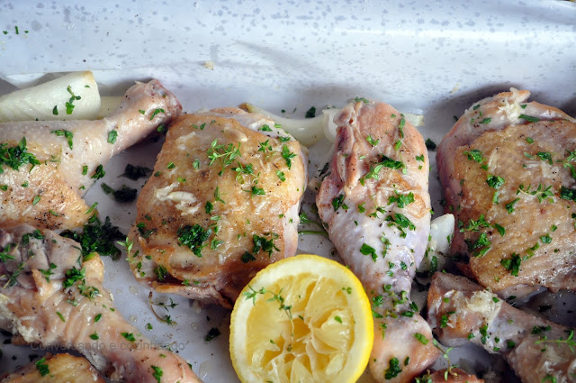 3. Coloque os pedaços de frango já dourados na forma, entre as cebolas e os dentes de alho, jogue o suco do limão e restante dos temperos por cima.