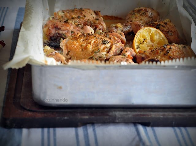 Frango... de todos os jeitos! Assado, ao molho, grelhado, na torta... Aqui em casa gostamos e consumimos muito. Não dá nem pra falar em variação e preferência, mas o assado é meu "queridinho" por vários motivos e um deles é a praticidade de colocar no forno e não me preocupar em ficar olhando para não queimar. Tento variar apenas os temperos e o modo com que ele vai ser assado. O de hoje eu apenas dei uma "fritada" antes de temperar e colocar no forno. Coisa rara isso por aqui, viu?! Não curto muito fritar nada, nem um tipo de alimento, mas confesso que vez ou outra rola, e ele ficou super gostoso.