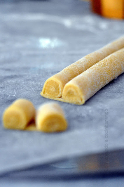 5. Enrole como se fosse um rocambole ate a metade da massa aberta, depois faça o mesmo do outro lado. Depois da massa enrolada é hora de cortar. Faça o corte de acordo com o seu gosto, mas caso queira uma igual a minha, meça mais ou menos um dedo e meio para cada corte.